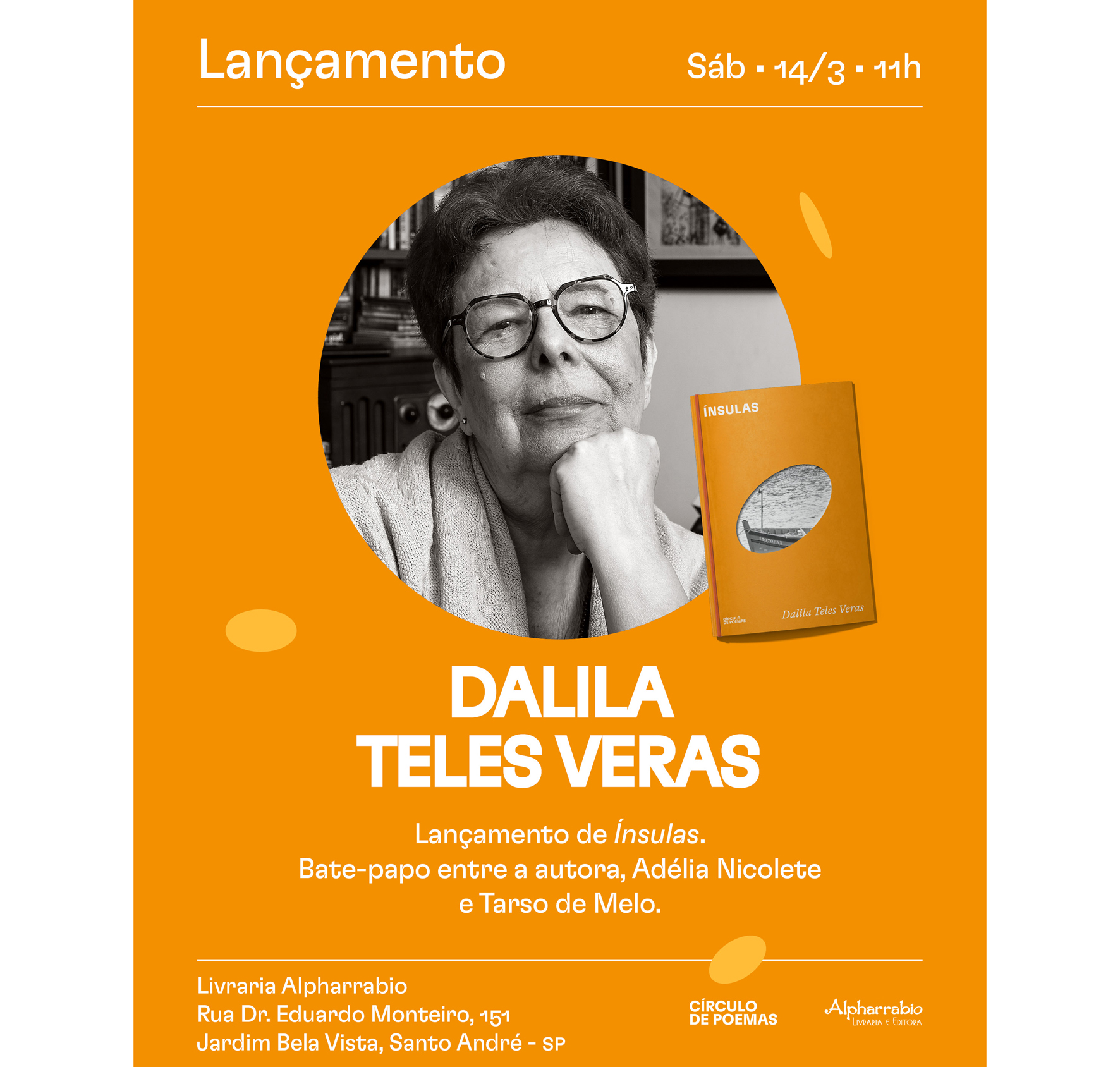 <p>Dalila Teles Veras nasceu no Funchal (Ilha da Madeira, Portugal), em 1946, e vive no Brasil desde os onze anos. Dirige a livraria, editora e centro cultural Alpharrabio, em Santo André (SP), desde 1992. Autora de fuga e urgências (Alpharrabio, 2022) e Opções para morrer no espaço (Patuá, 2024), entre diversos livros de poesia, crônica e ensaio. É doutora honoris causa pela Universidade Federal do Grande ABC (UFABC).</p>