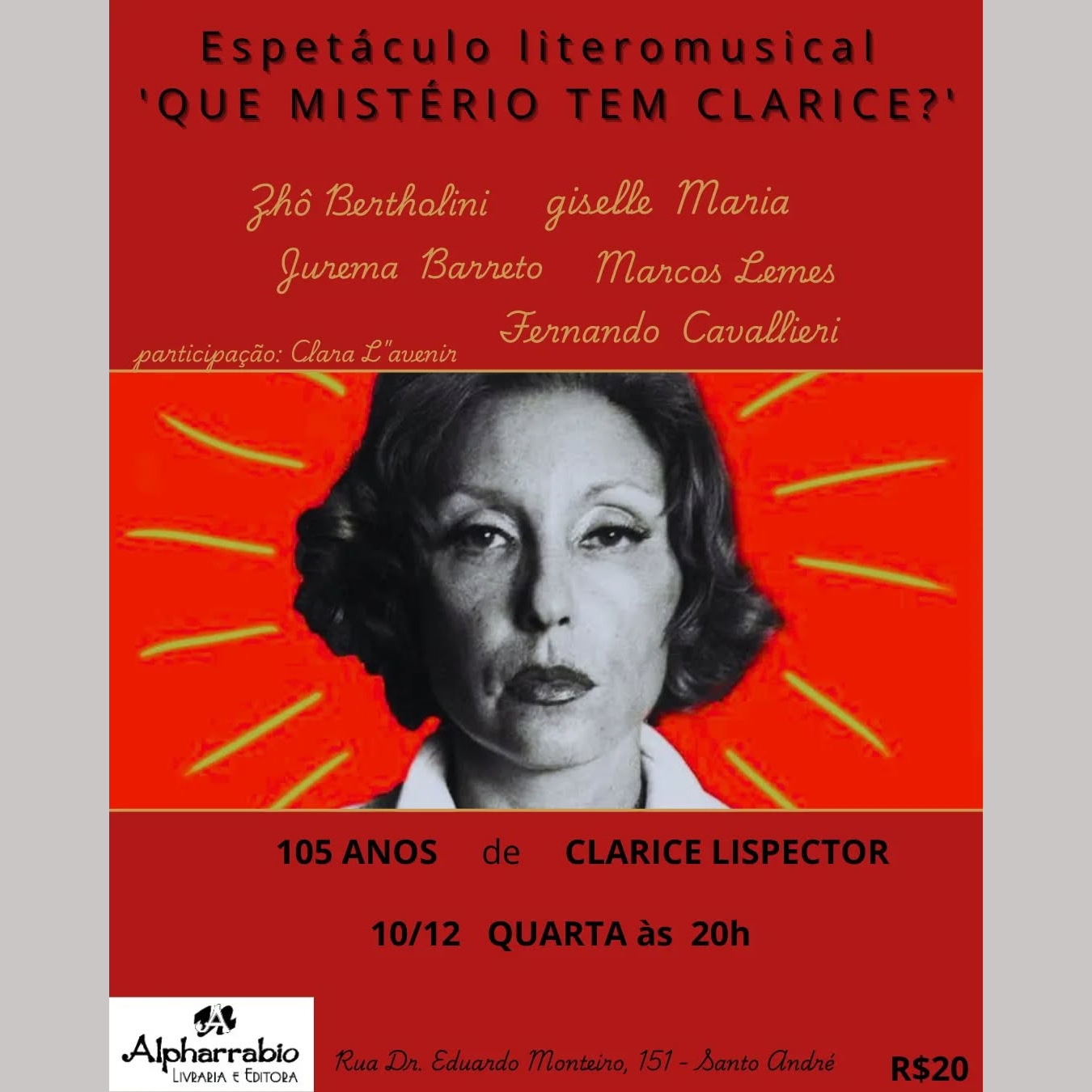 <p>Costurada por canções inspiradas em Clarice (como o próprio nome do espetáculo, em alusão a música de Caetano Veloso), textos de seus livros musicados por artistas como Cazuza e trechos performados e declamados de sua obra, a apresentação traz para o palco aprofundamentos sobre a vida, morte, criação, Deus, cotidiano, palavra, silêncio, solidão…<br class="html-br" /><br class="html-br" />O espetáculo é Idealizado pelos poetas Zhô Bertholini – Jurema Barreto @acigarra e construído pela cantora e escritora @gisellemaria.singer<br class="html-br" />– com o ator @marcoslemesartes e o músico @cavallieri2022<br class="html-br" /><br class="html-br" />*participação nesta exibição de @marispectr (leitura de texto)<br class="html-br" /><br class="html-br" />Até lá <span class="html-span xexx8yu xyri2b x18d9i69 x1c1uobl x1hl2dhg x16tdsg8 x1vvkbs x3nfvp2 x1j61x8r x1fcty0u xdj266r xat24cr xm2jcoa x1mpyi22 xxymvpz xlup9mm x1kky2od"><img class="xz74otr x15mokao x1ga7v0g x16uus16 xbiv7yw" src="https://static.xx.fbcdn.net/images/emoji.php/v9/t96/1/16/1f49c.png" alt="💜" width="16" height="16" /></span><br class="html-br" /><br class="html-br" />Duração: 1h15min<br class="html-br" />Entrada: R$ 20,00</p>